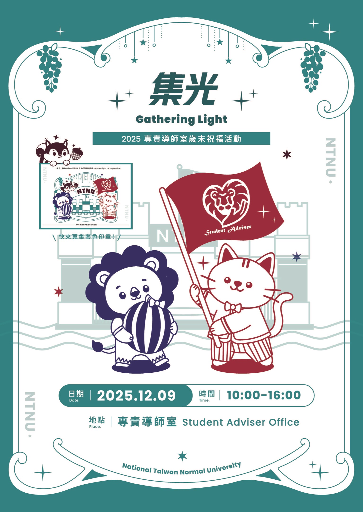 2025專導室歲末祝福活動「集光」活動訊息 / 2025-11-28 在歲月長河掬起波光粼粼每一片閃爍是生命的吉光片羽也許是新年第一道曙光或許是貓咪輕柔的呼嚕……什麼是你/妳生命裡的美好?讓我們蒐集這些美好化為前行的力量與希望
